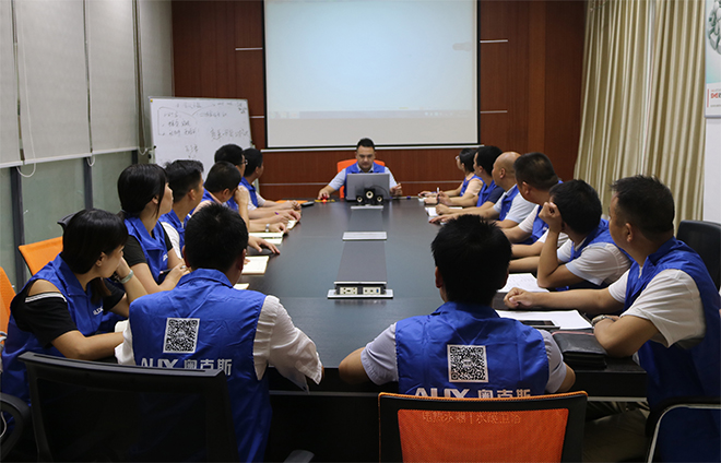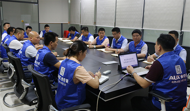 培訓(xùn)室內(nèi)奧克斯?fàn)I銷(xiāo)中心的成員均穿著簡(jiǎn)潔干練的工裝,一個(gè)個(gè)身形筆挺、情緒高昂。